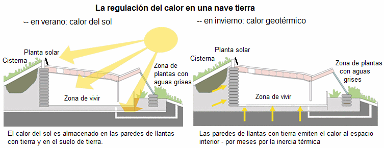 [7] Regulación del calor en la nave tierra con energía solar en verano y calor geotérmica en invierno, esquema: