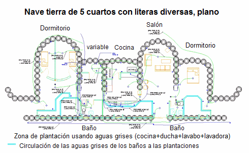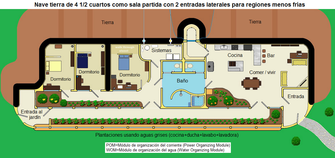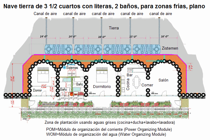 [29] Nave tierra de 3 1/2 habitaciones con 2 baños en literas para climas fríos, plano: https://www.arch2o.com/earthships-michael-reynolds/