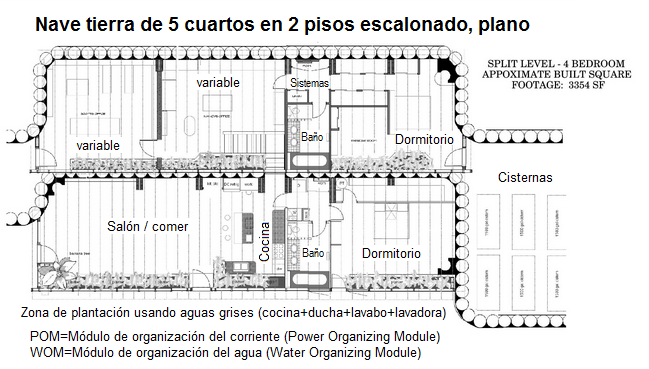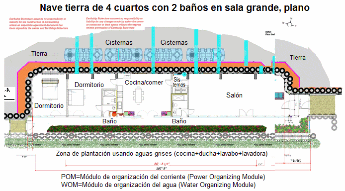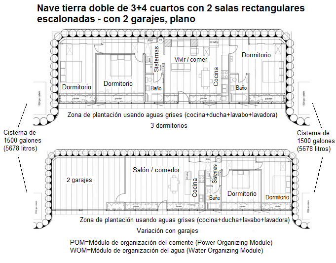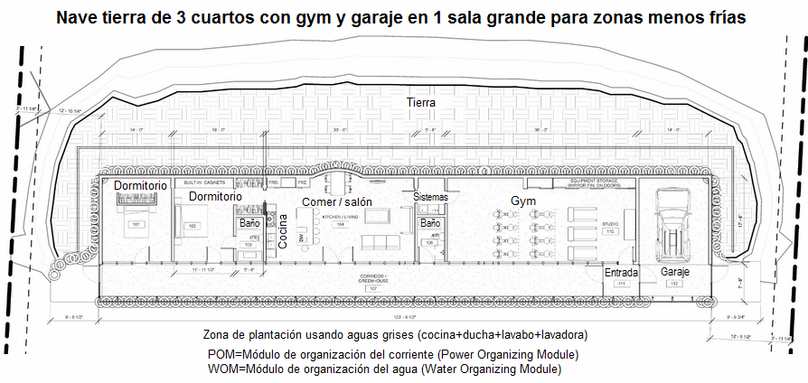 [30] Nave tierra de 3 habitaciones con gimnasio y garaje, sala rectangular, plano: https://www.arch2o.com/earthships-michael-reynolds/