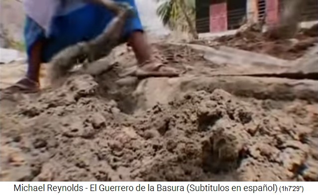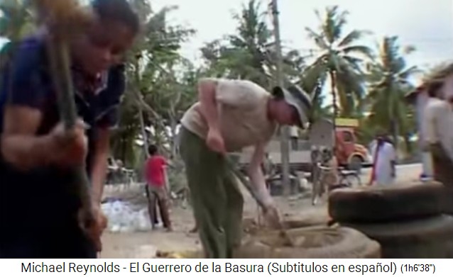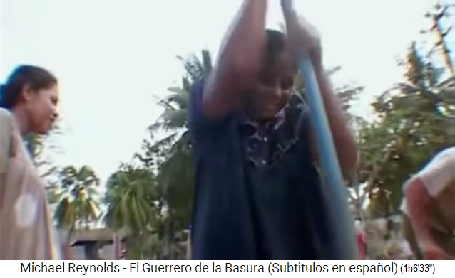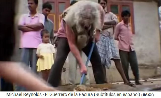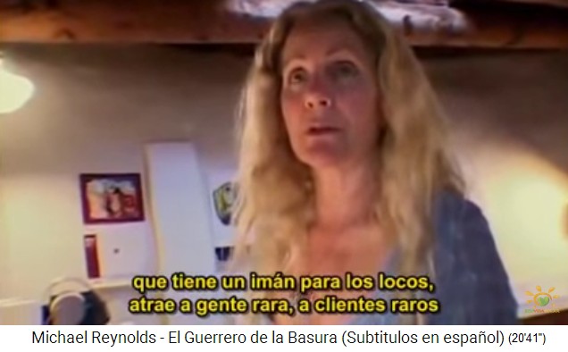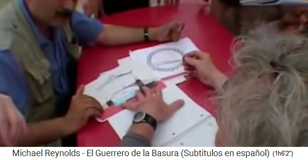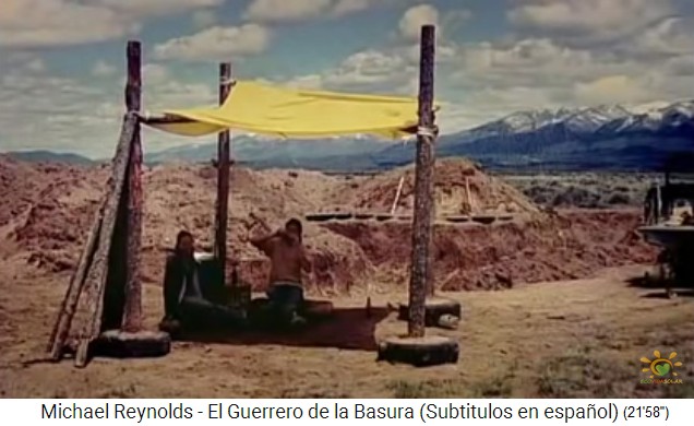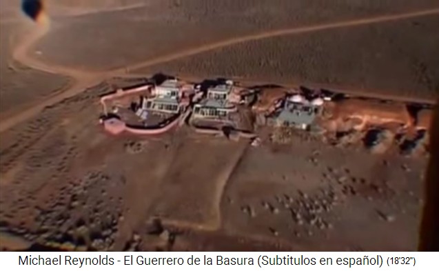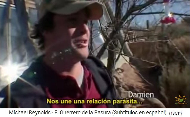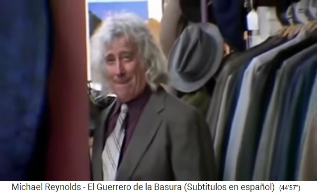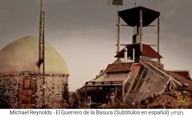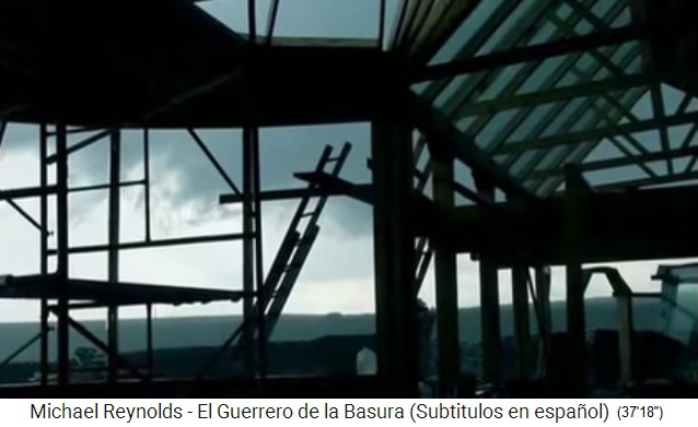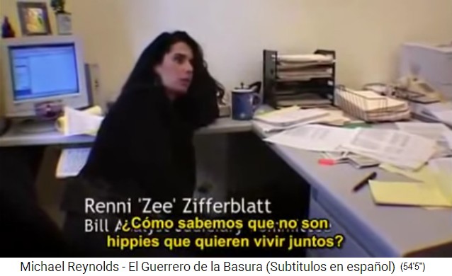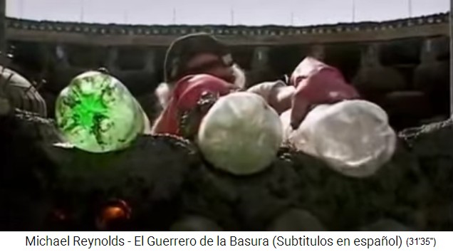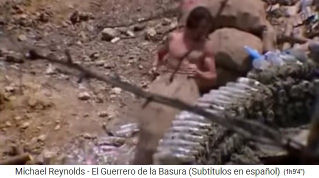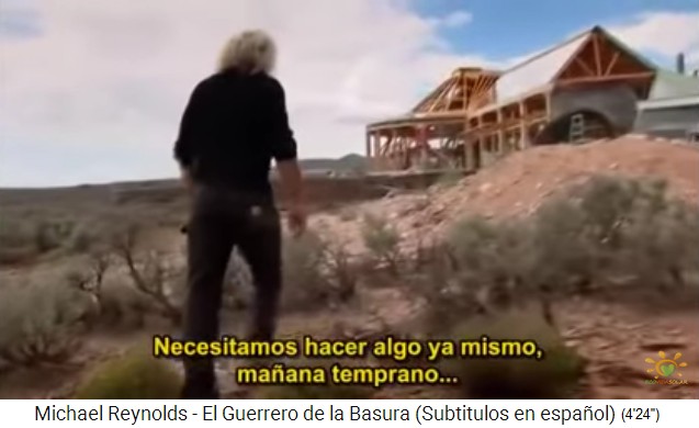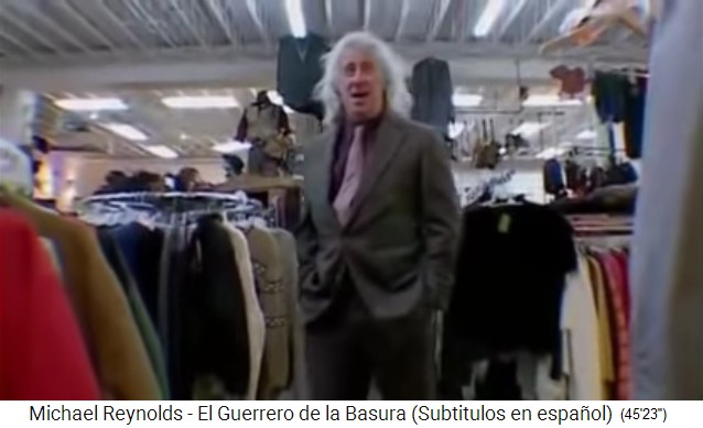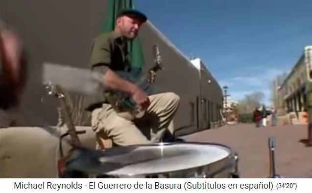 Guerrero de la basura, película de Oliver Hodge (2'0''). Michael Reynolds vive en una nave tierra de Taos en Nuevo México, su compañera lo describe como creativo y obstinado (2'55''). Michael Reynolds fue educado como bautista, todo estaba prohibido, por lo que surgió la reacción (3'9''). Estudió arquitectura en la Universidad de Cincinnati y consideró que la arquitectura indoctrinada enseñada como sin valor (3'35''), porque esta arquitectura no tenía nada que ver con el planeta y poco con los humanos. (3'40'').