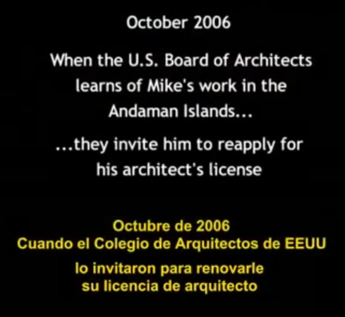 Panel de texto: octubre de 2006: La Cámara de Arquitectos de los "EUA" ha escuchado sobre la obra de Mike en las Islas Andamán y lo invita a solicitar la licencia otra vez (1h25'27'').