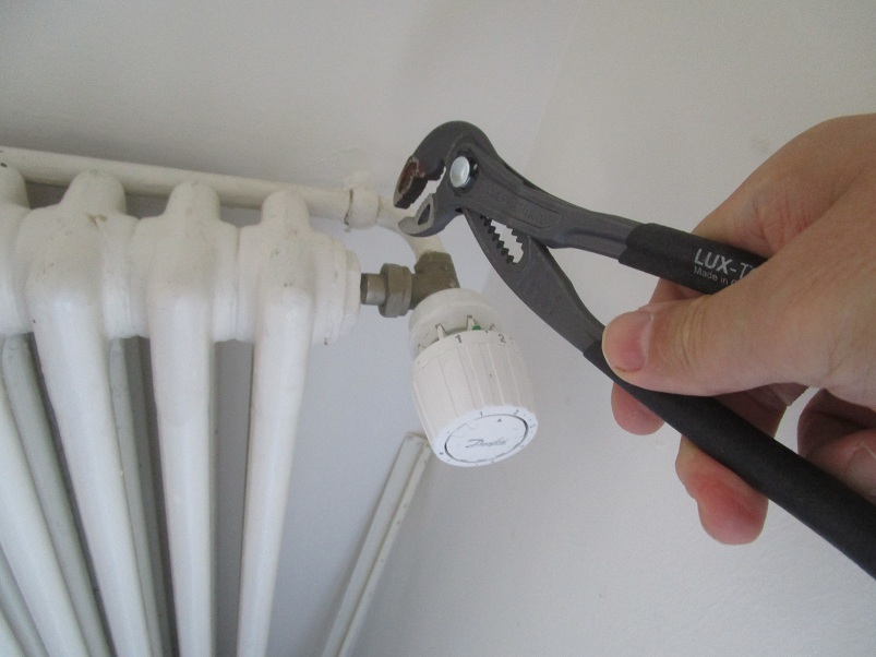 -- dann kann der Heizungsmonteur die Schraube am Heizungsrohr etwas lösen, so dass durch das gelockerte Gewinde die überflüssige Luft aus dem Heizkörper herausströmt, bis das Heizwasser kommt