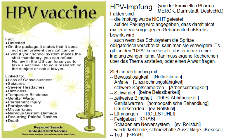 Die NWO-Pharma-Propaganda behauptet, es gäbe keine Impfschäden und keine Toten, hier das Beispiel von "infovac" aus der (kriminellen Pharma)-Schweiz: "Die Impfung gegen HPV zeichnet sich durch extrem gute Verträglichkeit aus (mehr als 21 Millionen Impfdosen wurden bereits abgegeben). Das Gerücht von Todesfällen bei Impfungen ist unbegründet. Die Überwachungsstellen in den USA, Europa und der Schweiz bestätigen, dass kein einziger Todesfall durch eine HPV-Impfung hervorgerufen wurde."