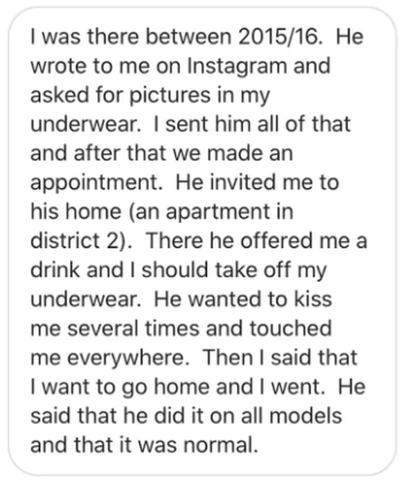 Männermodels berichteten letztes Jahr im Juni von sexuellen Belästigungen durch den Inhaber einer bekannten Modelagentur. Chatverläufe zeigten, wie er junge Männer auffordert, ihnen Nacktfotos zu schicken, um dem Traum von einer Karriere auf dem Laufsteg näherzukommen. Über ein Dutzend Betroffene hatten Anzeige erstattet.