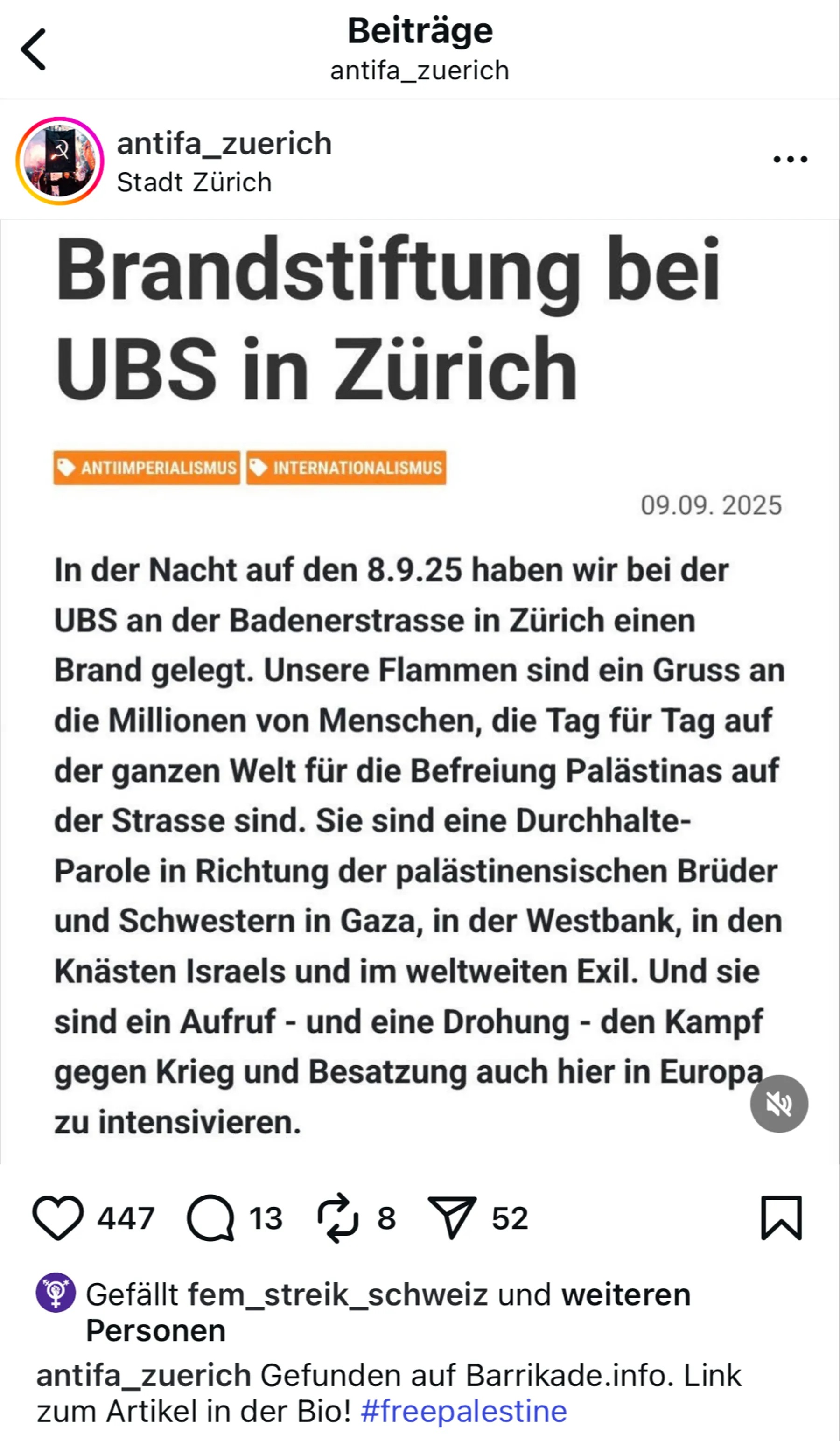 Die Antifa Zürich berichtete über ein Feuer, das sie bei einem UBS-Gebäude gelegt hatte. Der Account «Feministischer Streik Schweiz» setzte einen Like unter den Post. «Der Like war ein Versehen», behaupten die Account-Betreiberinnen.Prominent macht die Antifa Zürich auf eine kürzliche Tat aus ihren Kreisen aufmerksam. «Brandstiftung bei UBS in Zürich», lautet der Titel der Meldung vom neunten September.