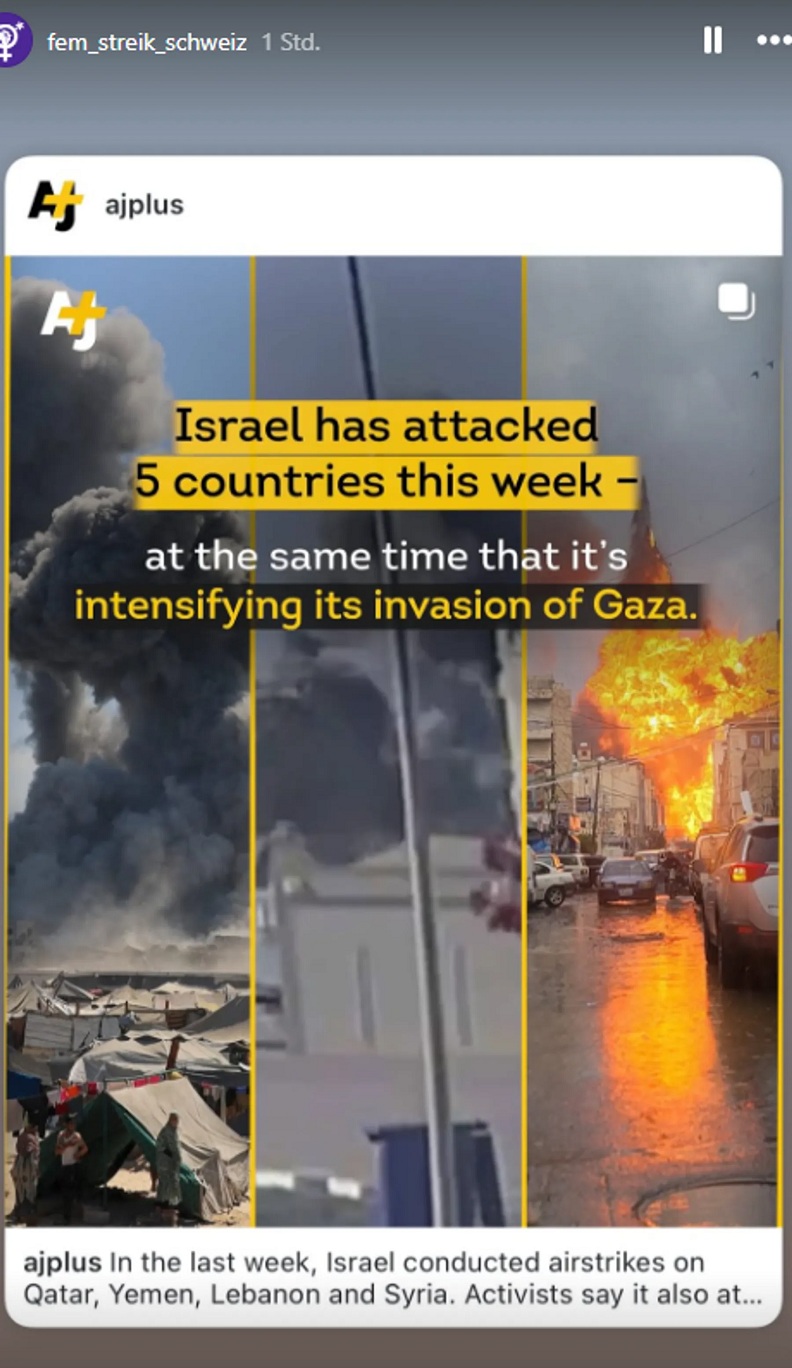 Quer in der Landschaft stand der Like für den Brandanschlag auf ein UBS-Gebäude im Zusammenhang mit Palästina nicht. Hin und wieder postet der Kanal auf Instagram auch Storys zum bewaffneten Konflikt zwischen israel und Palästina. In diesen teilen sie Posts von palästina-freundlichen Gruppen.
