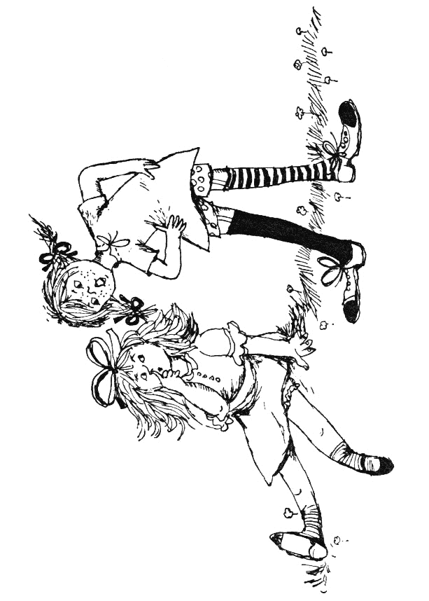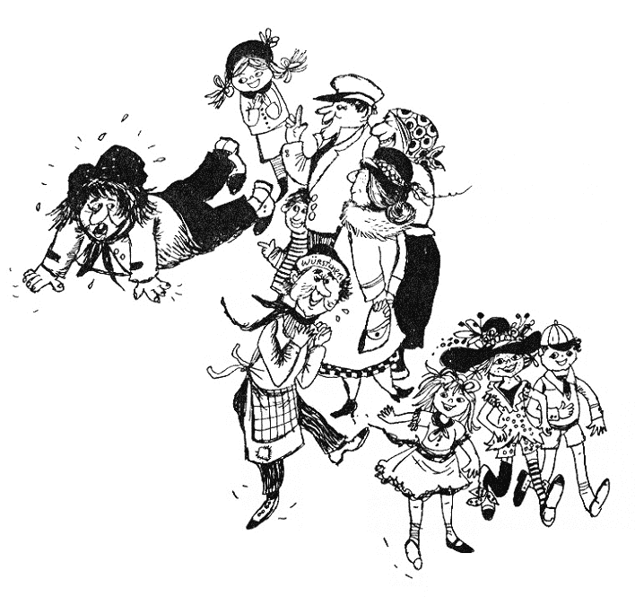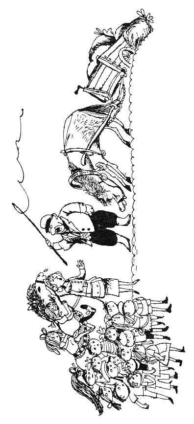 Pipi, Thomas, Annika y Sr. Nilsson marchando con un