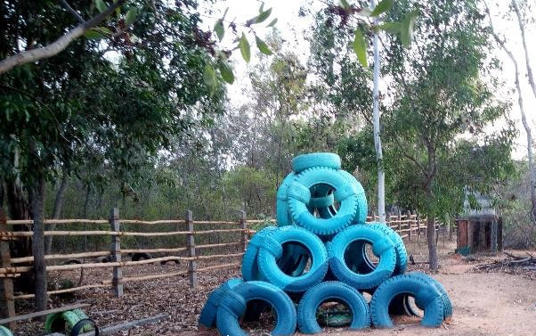 llantas antiguas verticales, Sadhana Forest (bosque de