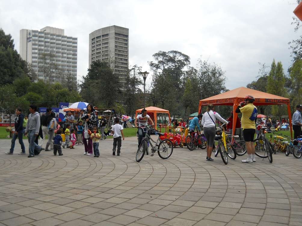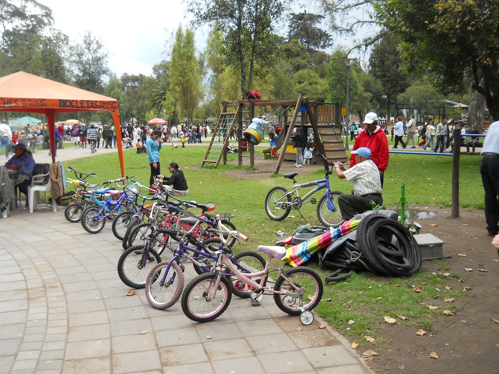 Kinderfahrrad und Jugendfahrrad ausleihen (++) mit Reparaturstation (+) in einem Park mit vielen Spielgeräten (+) und Bäumen, die Schatten spenden (+) und mit gut gepflegten und gut entwässernden Wegen (+). In dieser Angelegenheit ist der Ejido-Park (parque Ejido) in Quito in Ecuador wirklich nachahmenswert und erhält in diesem Sinn (++++++) SECHS Plus. Nur der Regen kann hier dem Spasserlebnis noch einen Strich durch die Rechnung machen.