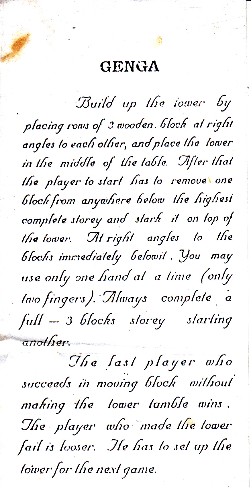 Bild up the tower by placing rows of 3 wooden block at right angles to each other, and place the tower in the middle of the table. After that the player to start has to remove one block from anywhere below the highest complete storey and stark it on top of the tower. At right angles to the blocks immediately belowit. You may use only one hand at a time (only two fingers). Always complete a full - 3 blocks storey starting another.