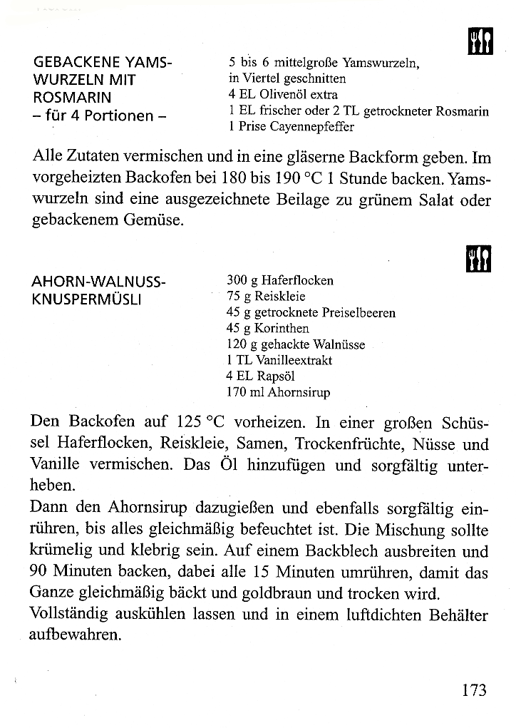 Dr. D'Adamo: Gebackene Yamswurzeln mit Rosmarin - Ahorn-Walnuss-Knuspermüsli, S.173