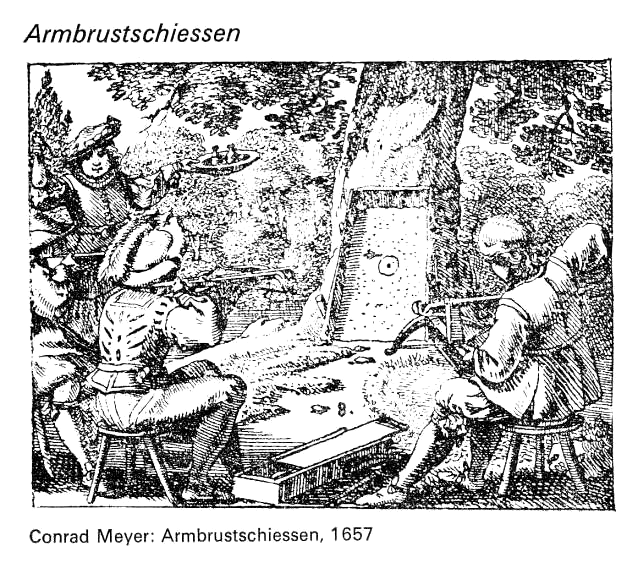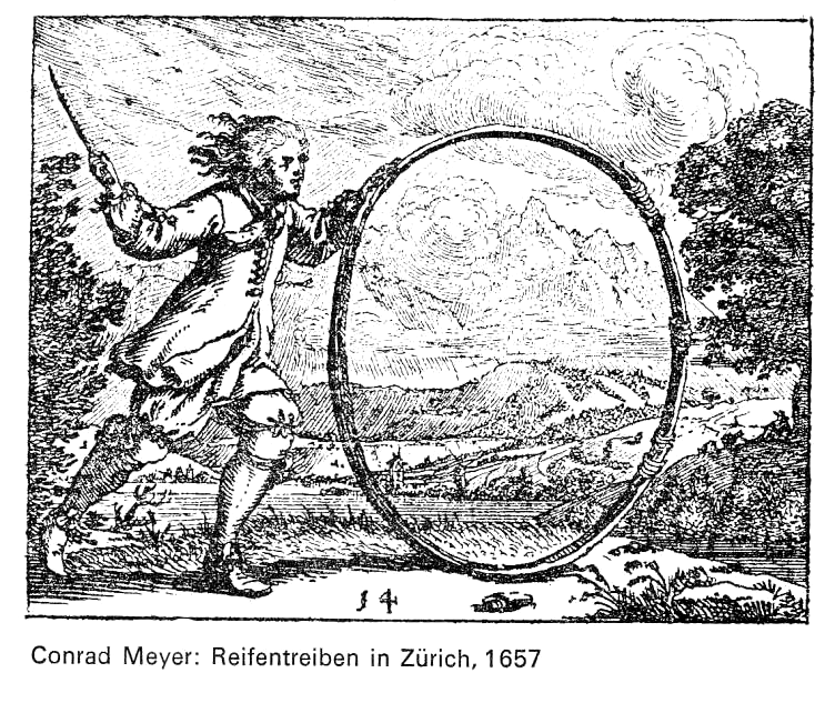 Die Stiche zu den Spielen Reifeln, Speirenlauf, Steckenpferdchen reiten, Kopfstehen, Maskenspiel, Armbrustschiessen und Stelzenlaufen stammen aus Conrad Meyers "Die Kinderspiele" (Verlag Berichthaus, Zürich 1970, Faksimileausgabe des 1657 von J. Cats verfassten Werks "620 nichtige Kinderspiele".