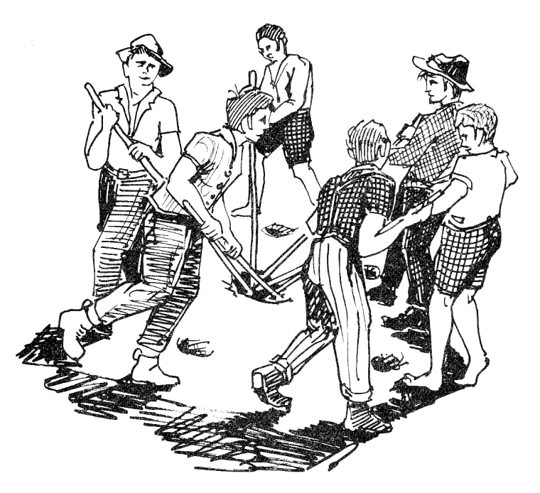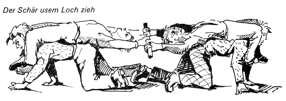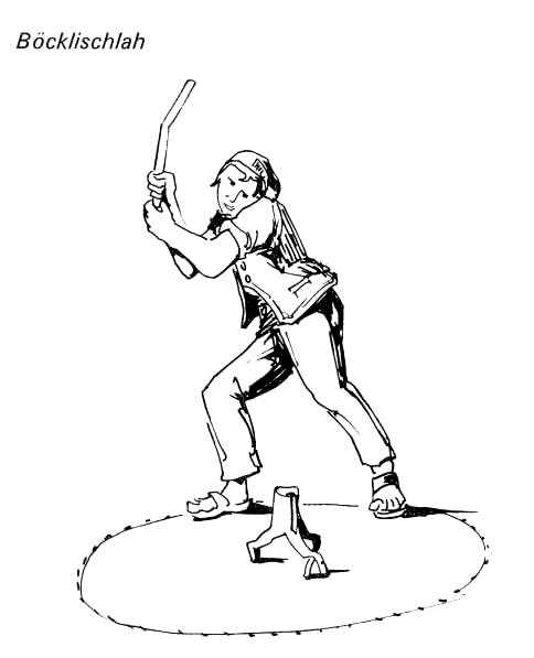 aus: Alte Kinderspiele [in der Schweiz]. Eine Sammlung volkskundlicher Bewegungsspiele; von Walter Seiler, mit Zeichnungen von Gustav Ritschard; dargestellt anlässlich der 700-Jahrfeier Unterseens im Jahre 1979. Sonderdruck der Schweizerischen Lehrerzeitung, Ausgabe "Schulpraxis", Monatsschrift des Bernischen Lehrervereins BLV, Nr. 25, 21. Juni 1979. Druck: Eicher + Co., 3001 Bern