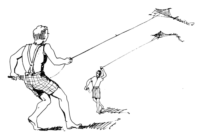 Alljährlich im Herbst, wenn das Laub von den Bäumen fällt, zieht es die Knaben hinaus aufs Feld zum Drachenfliegen. Uralter menschlicher Ikarus-Traum findet darin seine bescheidene Knabenerfüllung. Urheimat des Drachens scheint Ostasien zu sein.
