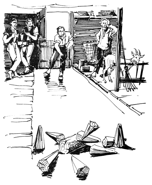 Material: 2 Tabourets, 2 Stöcke, 1 Paar Schuhe (S.22).