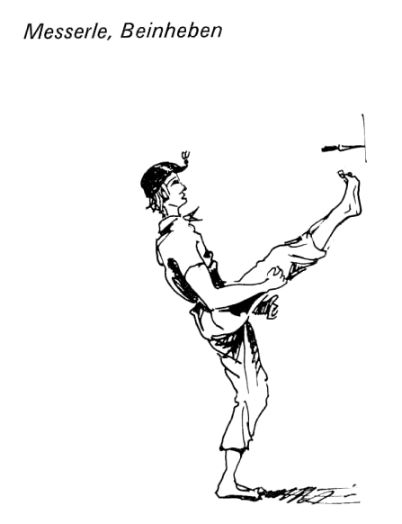 Freischwebend muss der Spieler zuerst den linken Schuh mit dem Stock "abschlagen". Gelingt ihm dies, muss er den Stock unter den Füssen durch auf die andere Seite bringen. Nun gilt es, den rechten Schuh hinunterzustossen. Zum Schluss des Kunststückleins soll der Stock in der rechten Hand sein.