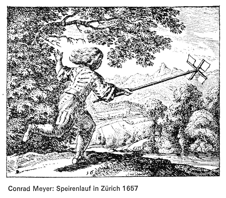 J. Catsen, der niederländische Dichter, erwähnt den Speirenlauf schon 1657. Hierzulande war das Gerät auch unter dem Namen "Fleuder" bekannt. Brueghel stellte auf seinem Bild sogar ein "Fleuderturnier" zweier Mädchen dar. Heute sind solche buntfarbige "Windräder" auf dem Markt erhältlich oder aus Papier einfach herzustellen.