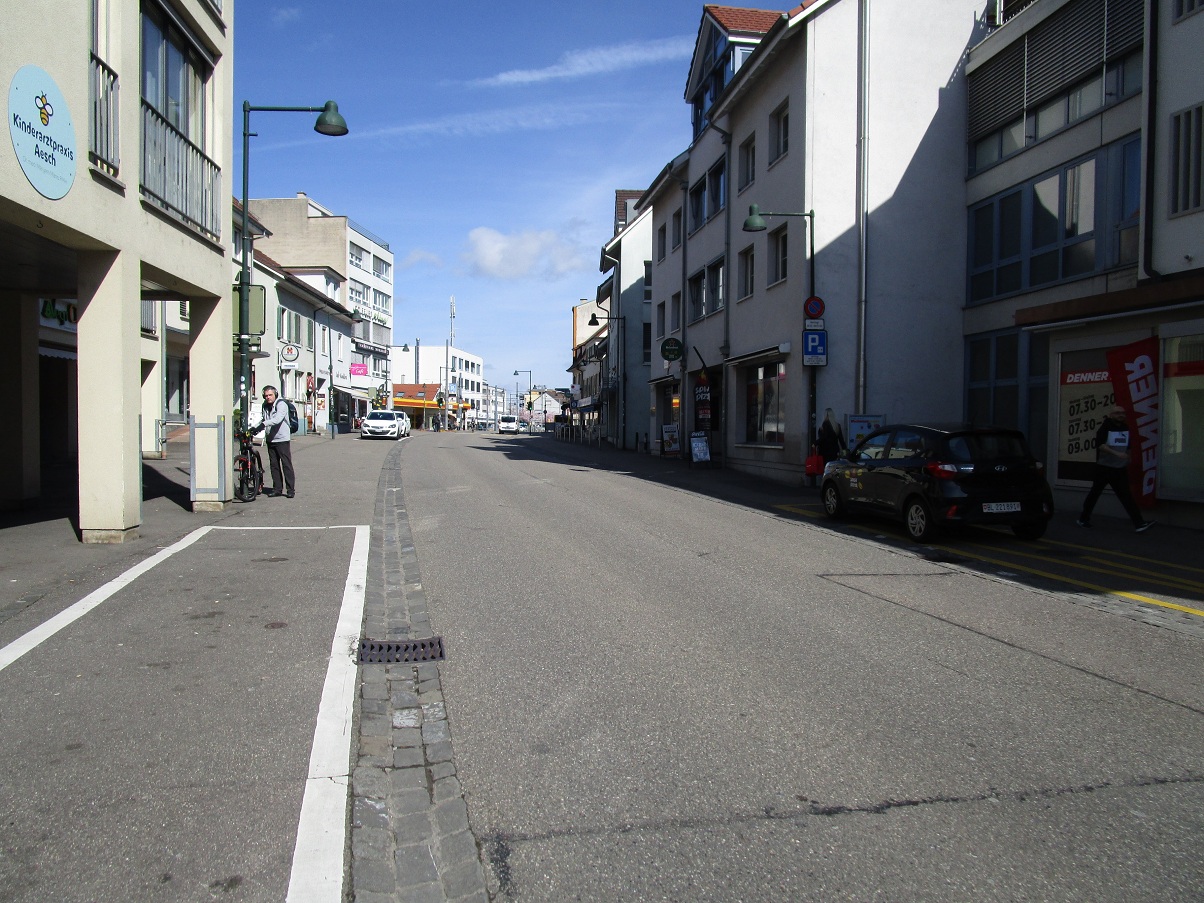 Aesch (Kanton Basel-Land, Schweiz): Trottoir abgeschafft, Abtrennung durch eine 3zeilige Rinne mit Pflastersteinen PLUS Sicherheitslinie [z2,z3]