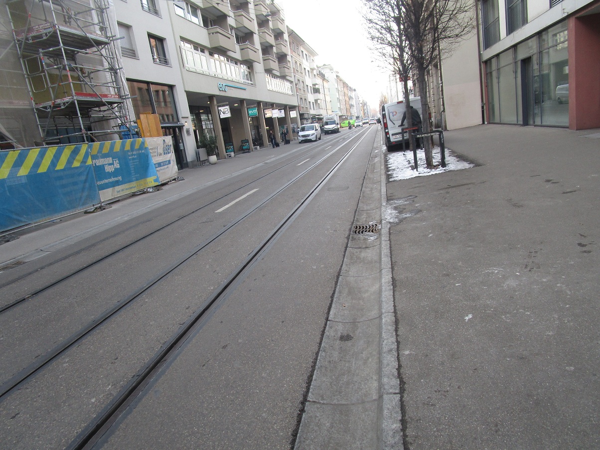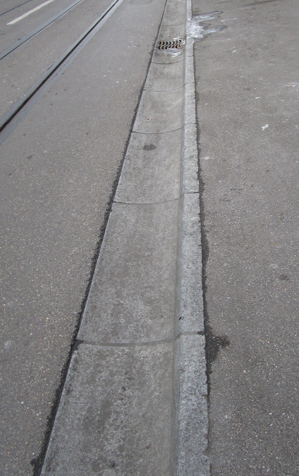Güterstrasse ist eine Mulde ohne brutale Kante, Zoom   Basel (Schweiz): Die Trottoirkante an der