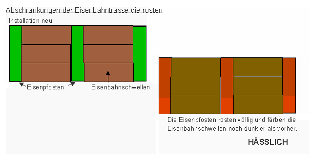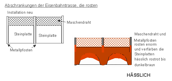 und rostrot bis dunkelbraun anlaufen, aus Metallpfeilern mit Eisenbahnschwellen dazwischen, oder aus Steinplatten mit rostendem Maschendraht darüber gesetzt (z.B. auf der Strecke zwischen Gotthardtunnel und Lugano HÄSSLICH