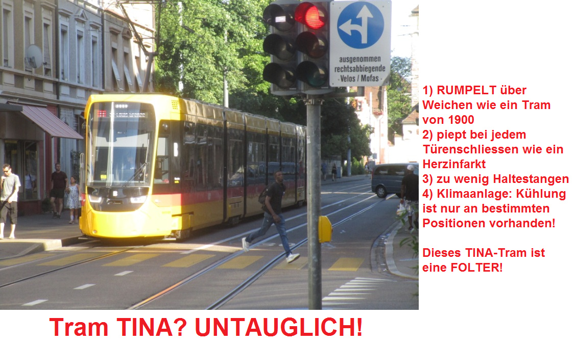 Tram TINA von Stadler Rail: Rumpeltram - Herzbaracken-Piepsen bei jedem Türenschliessen - zu wenig Haltestangen - Klimaanlage geht nicht