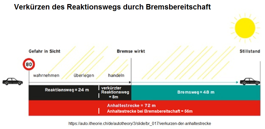 -- die Bremsbereitschaft verkürzt den Reaktionsweg um bis zu 2/3 (Berechnung des Bremswegs mit Bremsbereitschaft: 1/10 der Geschwindigkeit)