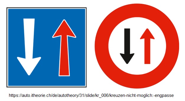 Das Signal «Dem Gegenverkehr Vortritt lassen» verpflichtet den in Richtung des roten Pfeils fahrenden Fahrer bei Hindernissen auf der Fahrbahn, dem Gegenverkehr den Vortritt zu lassen.
