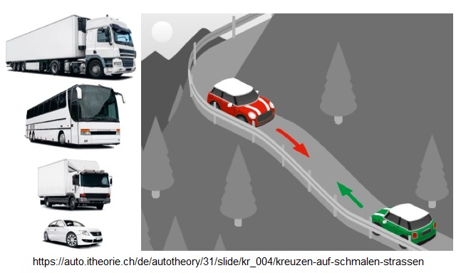 Kreuzen auf schmalen Strassen: Die Prioritätenfolge: Anhängerzüge, Bus, Lkw, Auto, Ausweichstelle [8]