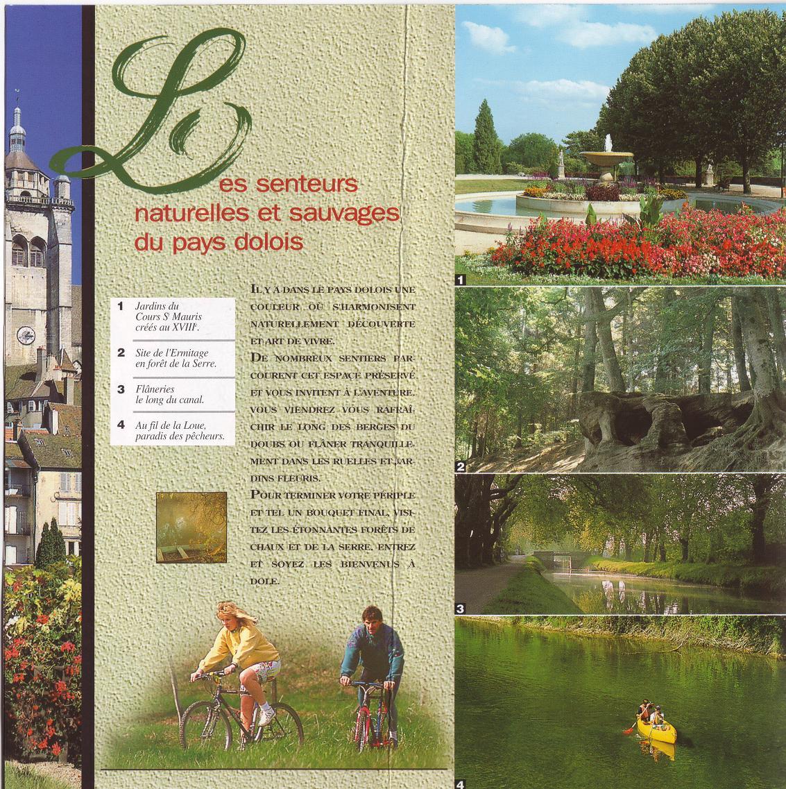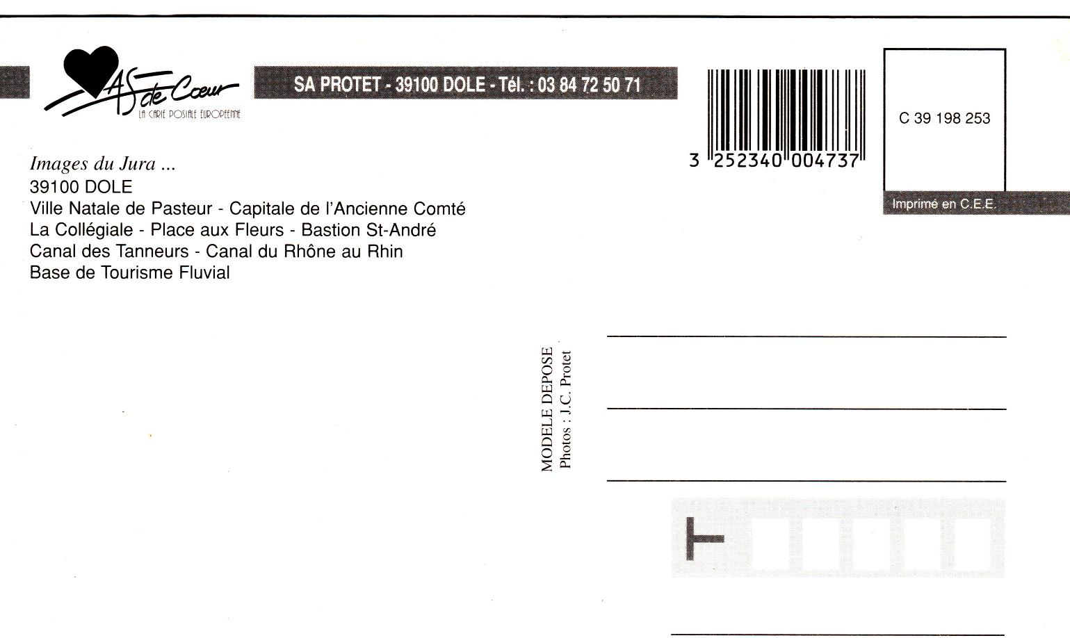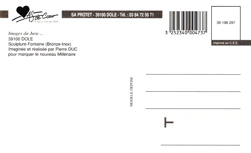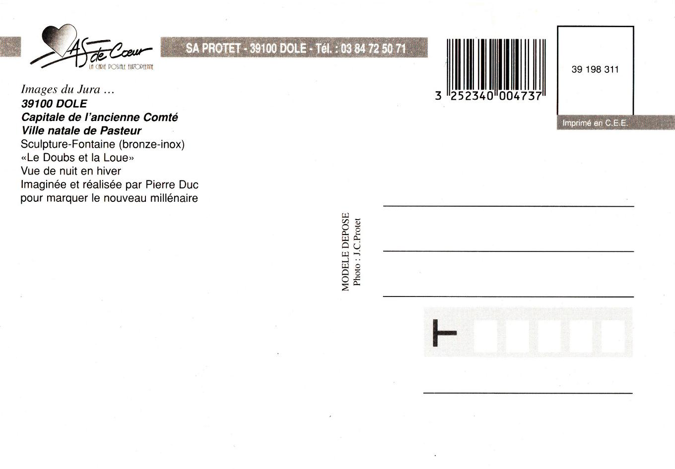 Der Text übersetzt: "Bilder vom Jura... 39100 Dole, Hauptstadt er einstigen Grafschaft, Geburtsstadt von Pasteur; Brunnenskulptur (Bronze-Edelstahl): "Der Doubs und die vier Sphären"; Abendbild im Winter; Entwurf und Realisation von Pierre Duc, um das neue Jahrtausend zu verdeutlichen."