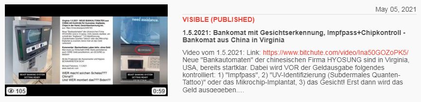 Video vom 1.5.2021: Satanisten in China und in den "USA": Ein chinesischer Bankomat mit Gesichtserkennung und Chipkontrolle wurde erstmals in den "USA" in Virginia aufgestellt - Video hochgeladen am 5.5.2021 - Link: https://www.bitchute.com/video/Ina50GOZoPK5/