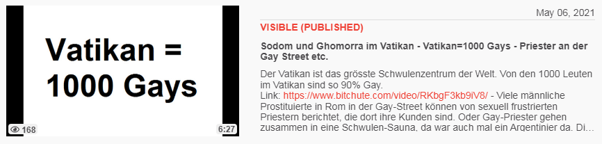 Video zur Geschichte: Kr.päd.kath. Gay-Vatikan sind 1000 Gays mit Sodom und Ghomorra im Vatikan, an der Gay Street in Rom usw. - Video hochgeladen am 6.5.2021 - Link: https://www.bitchute.com/video/RKbgF3kb9iV8/