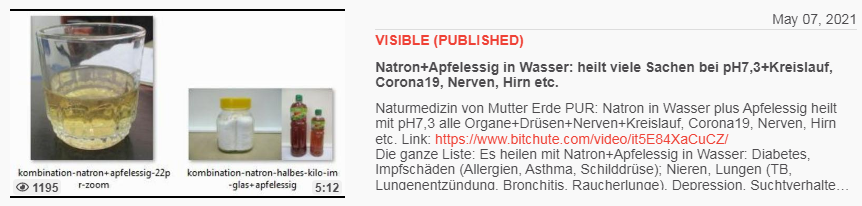 Video zur Naturmedizin: Natron+Apfelessig in Wasser - Video hochgeladen am 7.5.2021 - Link: https://www.bitchute.com/video/it5E84XaCuCZ/