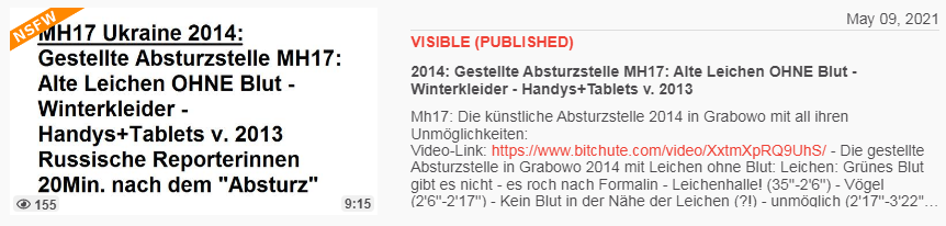 Video zur Geschichte: Die Ukraine und die Absturzstelle des Flugs MH17: Russische Reporter filmten zuerst 20 Minuten nach dem angeblichen Absturz: Gummipuppen, alte Leichen ohne Blut, hingestellte Koffer, Handys+Tablets von 2013 usw. - Video hochgeladen am 9.5.2021