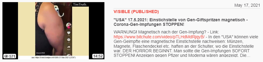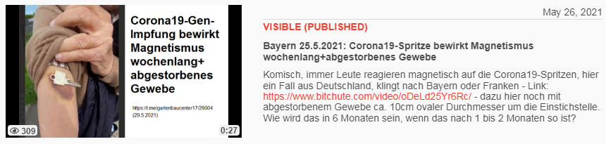 Corona-Wahrheiten in Bayern (4R): Der Impfarm wird nach der "Coronaimpfung" magnetisch und Gewebe ist abgestorben - Video hochgeladen am 25.5.2021
