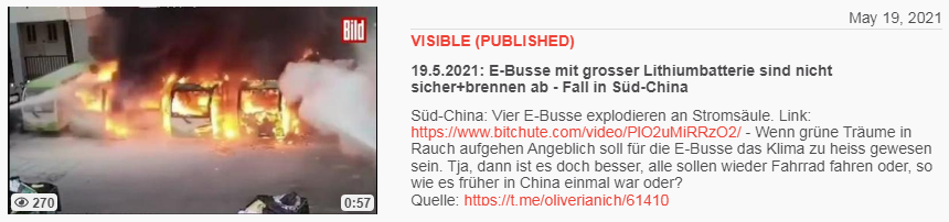 E-Fahrzeuge in China: 4 E-Busse brennen aus - Video hochgeladen am 19.5.2021 - Link: https://www.bitchute.com/video/PlO2uMiRRzO2/