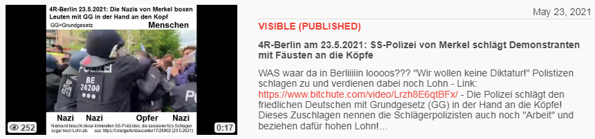 Corona-Terror in 4R-Berlin durch die COSTAPO SS-Polizei von Castellis: Polizei schlägt Wahrheitswisser mit der Faust an die Köpfe - Video hochgeladen am 23.5.2021 - Link: https://www.bitchute.com/video/Lrzh8E6qtBFx/