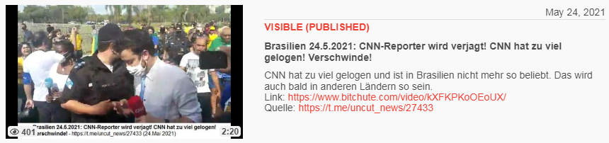 Widerstand gegen Coronawahn in Brasilien: Ein CNN-Reporter wird an einer Demo gegen den Coronaterror verjagt, er hat einfach zu viel gelogen - Video hochgeladen am 24.5.2021 - Link: https://www.bitchute.com/video/kXFKPKoOEoUX/