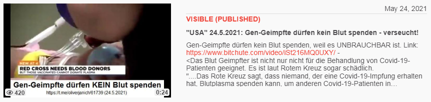 Corona-Wahrheiten in den "USA": Geimpfte dürfen kein Blut spenden - Video hochgeladen am 24.5.2021 - Link: https://www.bitchute.com/video/iSt216MQ0UXY/