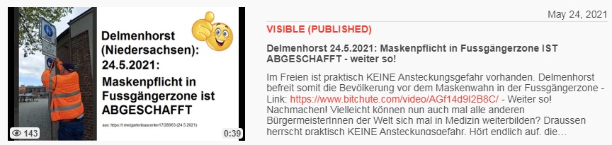 Widerstand gegen Coronawahn in Delmenhorst (Niedersachsen): Die Maskenpflicht wird in der Fussgängerzone abgeschafft, die Verkehrstafel wird "bereinigt" - Video hochgeladen am 24.5.2021 - Link: https://www.bitchute.com/video/AGf14d9I2B8C/
