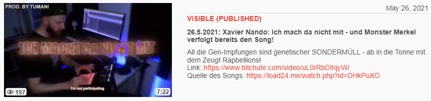 Widerstand gegen Coronawahn: Xavier Nando komponiert einen Song "Ich mach da nicht mit" - und er wird von der kr. Jüdin Merkel deswegen verfolgt! - Video hochgeladen am 26.5.2021 - Link: